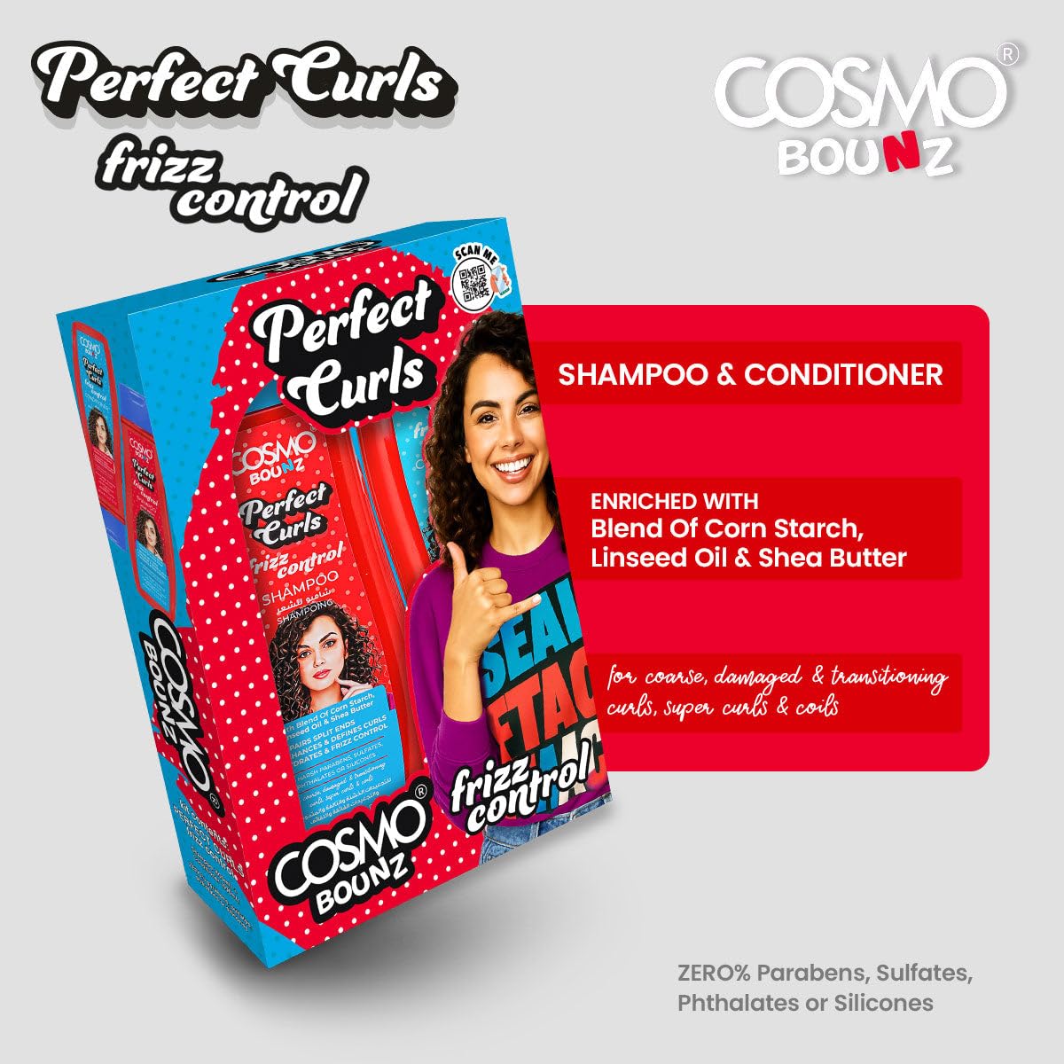 Perfect Curls Frizz Control Shampoo helps smooth curls from the first wash with a moisture-balanced formula that cleanses without drying. Corn Starch helps absorb excess oil, Linseed Oil supports softness and curl shape, and Shea Butter provides hydration and smoothness. It reduces frizz, leaves curls feeling fresh and light, and keeps each strand defined and manageable.