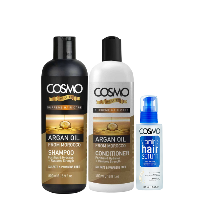HAIR CARE DELUXE - BEAUTE ARGAN OIL SHAMPOO 500ML - BEAUTE ARGAN OIL CONDITIONER 500ML - VITAMIN E HAIR SERUM 100ML